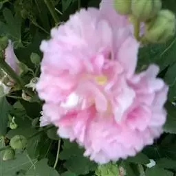 葛巾紫(学名:Paeonia suffruticosa ‘Gejin Zi’):落叶灌木。茎高,分枝短。叶通常为二回三出复叶,顶生小叶宽卵形,表面绿色,无毛,背面淡绿色,有时具白粉,沿叶脉疏生短柔毛或近无毛。花单生枝顶,苞片5,长椭圆形,大小不等;萼片5,绿色,宽卵形,大小不等;花瓣为重瓣,颜色紫色,绣球型,顶端呈不规则的波状;花丝上部白色,花药长圆形,花盘革质,杯状,紫红色;心皮5,密生柔毛。蓇葖长圆形,密生黄褐色硬毛。花期5月;果期6月。