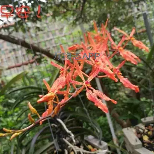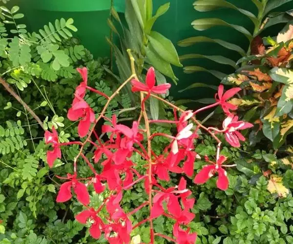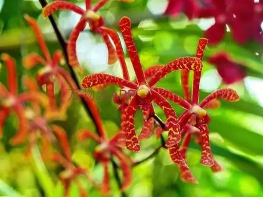火焰兰(学名:Renanthera coccinea Lour.):茎攀援,粗壮,质地坚硬,圆柱形,长1米以上,粗约1.5厘米,通常不分枝。叶二列,斜立或近水平伸展,舌形或长圆形。花序与叶对生,常3-4个,粗壮而坚硬,圆锥花序或总状花序疏生多数花;花火红色,开展;花瓣相似于中萼片而较小,先端近圆形,边缘内侧具桔黄色斑点;唇瓣3裂。花期4-6月。