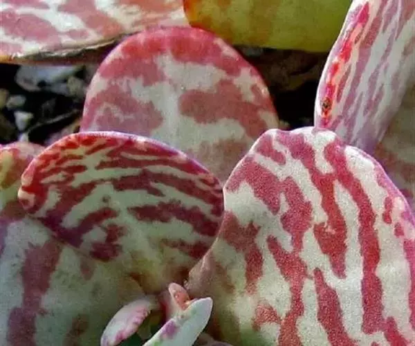 为多年生肉质植物,植株呈灌木状,通常在基部分枝,茎圆柱形,直立生长。肉质叶交互对生,无柄,叶片倒卵形,叶缘有不规则的波状齿,长约10厘米,蓝灰至灰绿色,被有一层薄薄的白粉,表面有红褐至紫褐色斑点或晕纹。