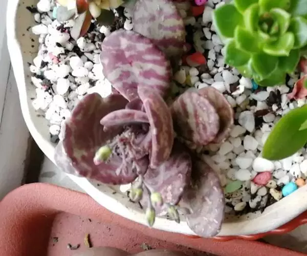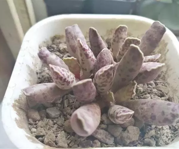 江户紫叶片肥厚,灰绿或蓝绿色叶面上布满了紫褐色斑点,犹如一块美丽的调色板,是多肉植物中的观叶佳品,大型植株可供布置温室、植物园中的沙漠生态景观,江户紫叶片有独特的色调,是多肉植物中的观叶佳品,家庭栽培可以美化阳台、窗台、客厅、书房,奇特可爱。适合家庭栽种。