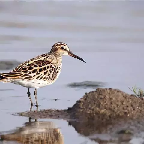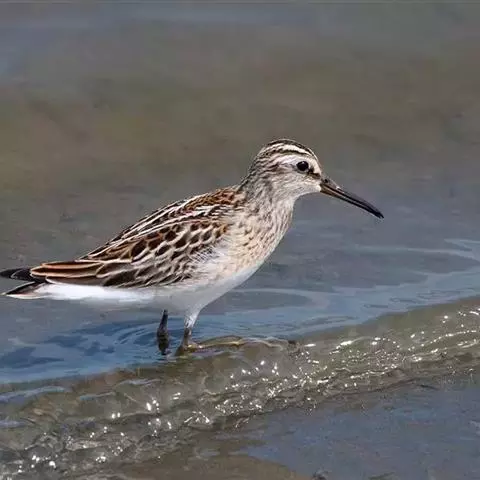 阔嘴鹬是涉禽,体长17厘米。特征为翼角常具明显的黑色块斑并具双眉纹。与黑腹滨鹬平滑下弯的嘴相比,…