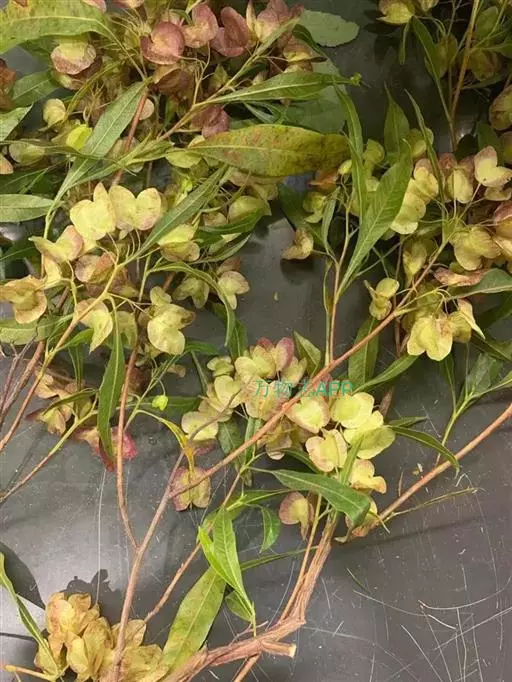 花序顶生或在小枝上部腋生,比叶短,密花,主轴和分枝均有棱角;花梗纤细,长2-5毫米,有时可达1厘米;萼片4,披针形或长椭圆形,长约3毫米,顶端钝;雄蕊7或8,花丝长不及1毫米,花药长2.5毫米,内屈,有腺点;子房椭圆形,外面有胶状粘液,2或3室,花柱长约6毫米,顶端2或3深裂。蒴果倒心形或扁球形,2或3翅,高1.5-2.2厘米,连翅宽1.8-2.5厘米,种皮膜质或纸质,有脉纹;种子每室1或2颗,透镜状,黑色。花期秋末,果期冬末春初。