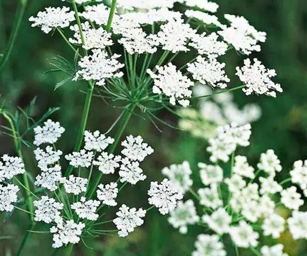复伞形花序直径2.5-8厘米,伞辐4-15。不等长;小总苞片5-8,卵形至披针形,顶端尖锐,反折,边缘有睫毛或近无毛;花白色,通常带绿或黄色;花柱较花柱基长2倍。