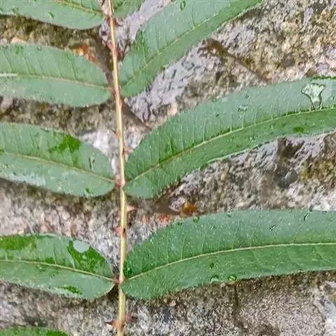 青花椒属灌木;枝灰褐色,有短小皮刺。小叶椭圆形或椭圆状披针形,边缘有细锯齿,齿缝间有腺点,表面绿色…