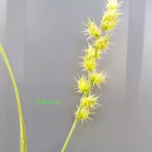 总状花序直立,长4-8厘米,宽约1厘米;花序主轴具稜粗糙;刺苞呈稍扁圆球形,长5-7毫米,宽与长近相等,刚毛在刺苞上轮状着生,具倒向粗糙,直立或向内反曲,刺苞背部具较密的细毛和长绵毛,刺苞裂片于1/3或中部稍下处连合,边缘被平展较密长约1.5毫米的白色纤毛,刺苞基部收缩呈楔形,总梗密具短毛,每刺苞内具小穗2-4(-6)个,小穗椭圆状披针形,顶端较长渐尖,含2小花;颖薄质或膜质,第一颖三角状披针形,先端尖,长为小穗的1/2,具1脉;第二颖长为小穗的3/4-2/3,具5脉;第一小花雄性或中性,第一外稃与小穗等长,具5脉,先端尖,其内稃狭长,披针形,长为其第一外稃2/3,第二小花两性,第二外稃具5脉,包卷同质的内稃,先端尖,成熟时质地渐变硬;鳞被缺如;花药长约1毫米,顶端无毫毛;柱头帚刷状,长约3毫米。