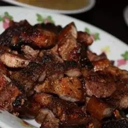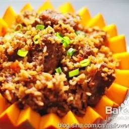 沙茶酱蒸牛仔骨 原料:鸭1只(1250克左右),沙茶酱125克、葱段15克、水发香菇25克、马铃薯12个、姜片5克、蒜泥25克、辣椒粉10克、白酒25克、白糖15克、酱油50克、味精10克、湿淀粉50克、猪骨汤750克、熟鸡油10克、熟猪油750克(实耗100克)。