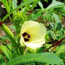 咖啡黄葵(学名:Abelmoschus esculentus (Linn.)Moench)亦称黄秋葵,锦葵科一年生草本植物。茎圆柱形,疏生散刺。叶掌状,裂片阔至狭,托叶线形,被疏硬毛。花单生于叶腋间,花梗疏被糙硬毛,小苞片钟形;花萼钟形,密被星状短绒毛;花黄色,内面基部紫色,蒴果筒状尖塔形,种子球形,具毛脉纹。花期5-9月。