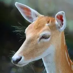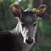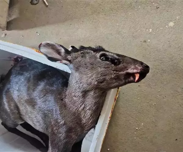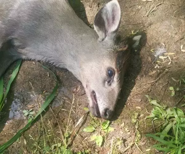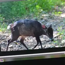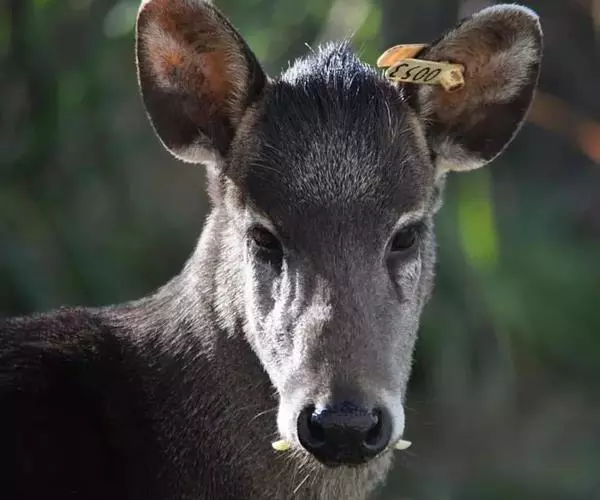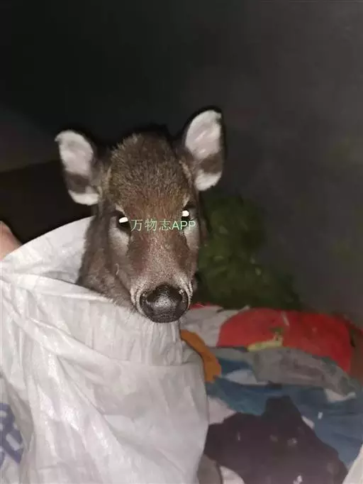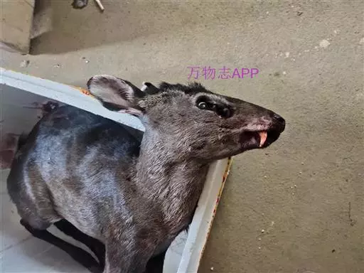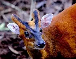 体 毛冠鹿 长约920毫米.尾长约120毫米,肩高490毫米,体重约30公斤左右。体中等大小,与赤鹿相仿、鼻端裸露,眼较小,无额腺,眶下腺特别显著。耳较圆阔。额部有一簇马蹄形的黑色长毛,故称毛冠鹿。雄鹿有角,角极短长度仅1cm左右,且角冠不分叉,尖略向下弯,隐藏在额顶上的一簇长的黑毛丛中;雌鹿无角。尾短。 ‘