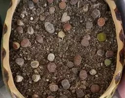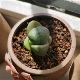荒玉为番杏科生石花属,原产南非。株体呈白粉色,表面布满凹凸纹路,凹陷处为红褐色,每年秋季开黄花。