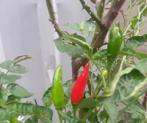 黑弹头辣椒为观赏椒品种。株高60厘米。叶深绿色,茎枝紫色,开紫花。果对生或簇生,呈小圆锥形,形似“子弹头”,味极辣。果长3厘米,果肩直径1.6厘米,果柄长2.5厘米。幼果黑色,成熟果鲜红色。坐果率高,每株可坐果100多个。在盛果期,椒果黑红朝天,如待发的密林防空弹头,颇为壮观。