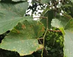 危害症状:最初叶片出现水渍状半透明小点,黄绿色,叶背处微红,叶脉隆起,扩大后成多角形坏死斑,红棕色至褐色。病叶变黑脱落。线虫在病芽、病叶、地面落叶和土壤中越冬,随浇水或雨水淋溅传播,从气孔侵入为害。