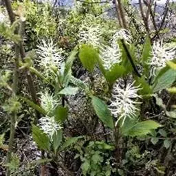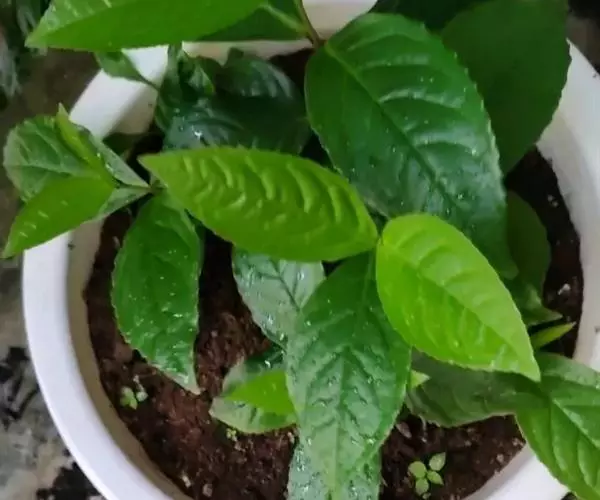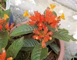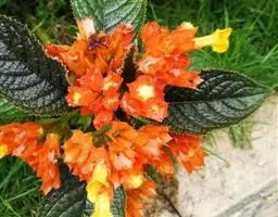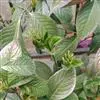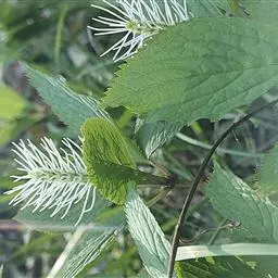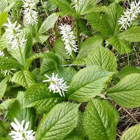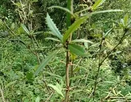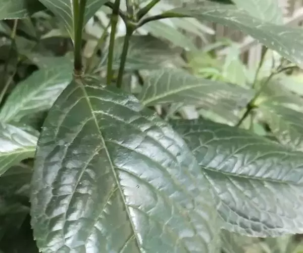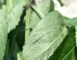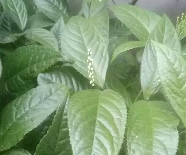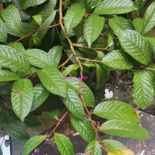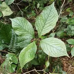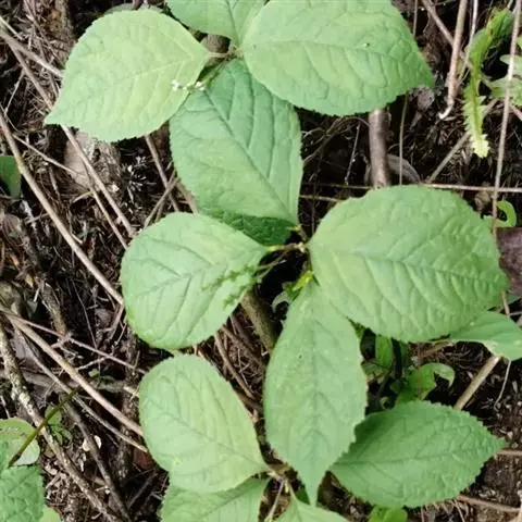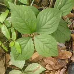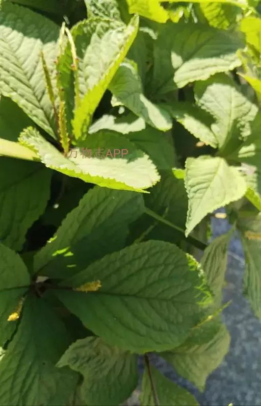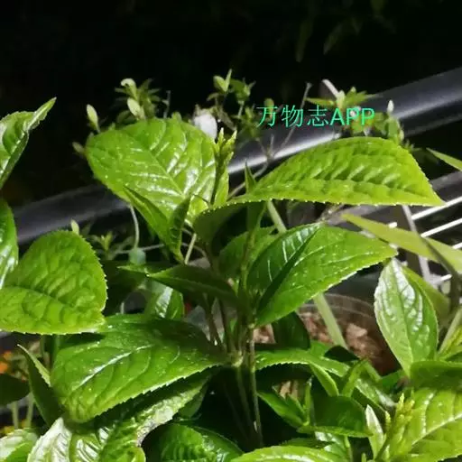 半灌木,直立或稍平卧,高30-60厘米;茎圆柱形,无毛。叶对生,厚纸质,椭圆形或倒卵状椭圆形,长5-11厘米,宽2.5-5.5厘米,顶端急尖或钝,基部楔形,边缘具圆齿状锯齿,齿端有一腺体,腹面深绿色,光亮,背面淡黄绿色,侧脉6-8对,两面稍凸起;叶柄长8-18毫米,基部多少合生;托叶微小。