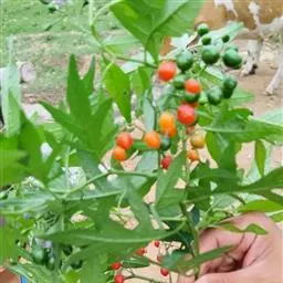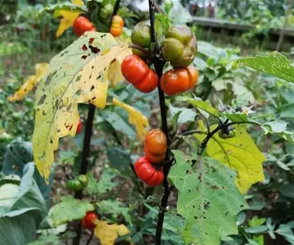 红茄(Solanum integrifolium Poir.),是茄属一年生草本,高约0.7米,茎,叶下面,叶柄及花梗均被5-9分枝有柄或无柄的星状绒毛,小枝黑褐色,毛被初时较密,以后逐渐脱落,具疏稀的浅黄色皮刺,皮刺先端深黄褐色。上部叶常假双生,不相等,叶片卵形至长圆状卵形,先端三角形,渐尖或钝,基部不相等,边缘作不规则的波状深裂,裂片三角形;叶柄长约2-7厘米,具有与中脉相似的皮刺。花序腋外生;花冠白色,略带紫晕,星形或近星状辐形,内面及外面均被星状绒羌,花冠筒长不到1毫米;花丝长约0.6-1毫米,无毛,花药披针状椭圆形;子房近圆球形。浆果橙黄色或猩红色,圆形,顶基压扁,每棱上又往往有1浅沟。种子肾形,淡黄色,直径2-3.5毫米。