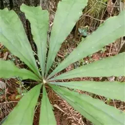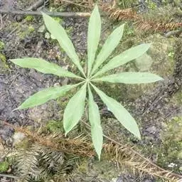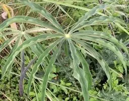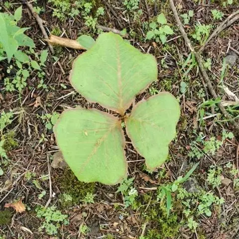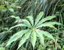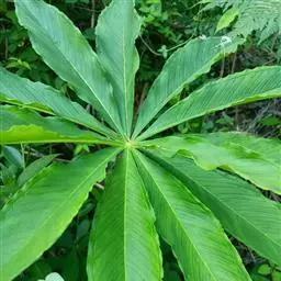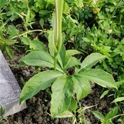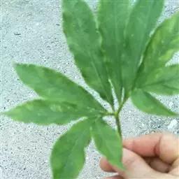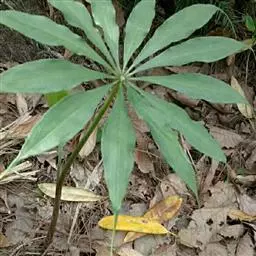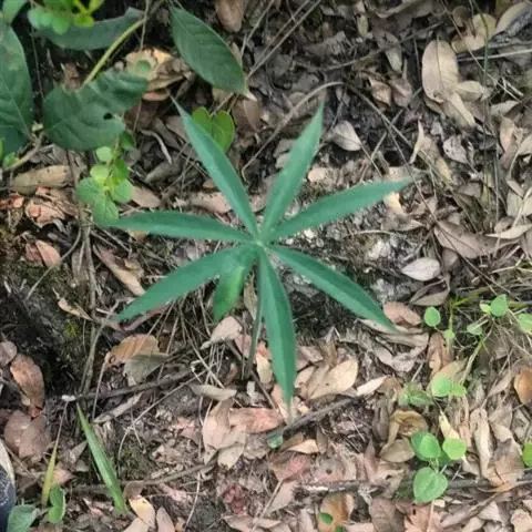 黄苞南星 块茎近球形,小,直径1.5-2.5厘米。鳞叶3-5,锐尖,内面的长8-25厘米。叶2-1,叶柄长12-27厘米,具鞘部分占4/5;叶片鸟足状分裂,裂片5-11(-15),芽时中裂片向上,余向下,长圆披针形或倒卵状长圆形,先端渐尖,基部楔形,长2.5-12厘米,宽0.6-3厘米,亮绿色,侧脉与中肋成锐角上升,细弱,常不连接为整合的集合脉。