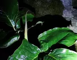花序柄常先叶出现,长于叶柄,长15-30厘米,绿色。佛焰苞为本属中最小的,长2.5-6厦米,管部卵圆形或球形,长1-1.5厘米,直径1-1.4厘米,黄绿色,喉部略缢缩,上部通常深紫色,具纵条纹;檐部长圆状卵形,长1.5-4.5厘米,宽0.8-2厘米,先端渐狭至锐尖,黄色或绿色,内面至少在下部为暗紫色,略下弯。