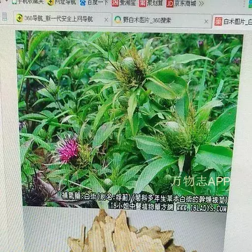 白术(学名:Atractylodes macrocephala Koidz.):菊科苍术属多年生草本植物,高可达60厘米,结节状根状茎。茎直立,全部光滑无毛。叶互生,叶片羽状全裂,侧裂片倒披针形、椭圆形或长椭圆形,顶裂片比侧裂片大,全部叶质地薄,纸质,两面绿色,无毛,头状花序单生茎枝顶端,苞叶绿色,针刺状羽状全裂。总苞宽钟状,顶端紫红色。瘦果倒圆锥状,8-10月开花结果。