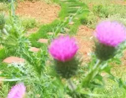 头状花序单生茎枝顶端,植株通常有6-10个头状花序,但不形成明显的花序式排列。苞叶绿色,长3-4厘米,针刺状羽状全裂。总苞大,宽钟状,直径3-4厘米。总苞片9-10层,覆瓦状排列;外层及中外层长卵形或三角形,长6-8毫米;中层披针形或椭圆状披针形,长11-16毫米;最内层宽线形,长2厘米,顶端紫红色。全部苞片顶端钝,边缘有白色蛛丝毛。小花长1.7厘米,紫红色,冠檐5深裂。