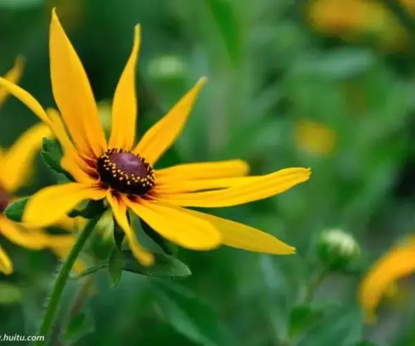 黑心菊主产北美,多年生草本,一般作1-2年生栽培,枝叶粗糙,全株被毛,近根出叶,上部叶互生,叶匙形及阔披针形,头状花序,呈半球形。适应性强,耐寒,耐旱,喜向阳通风的环境,一般土壤均可栽培,花期5-9月 。