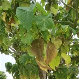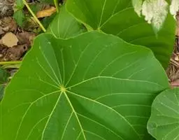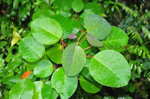 性状鉴别 :叶近圆形,革质,长5.5-11cm,宽6-11.5cm,基部近圆形,先端圆而有小凸尖;叶柄长3-7cm,顶端有2腺体。蒴果近球形,直径约1.5cm,表面紫褐色。内含种子3枚,种子近三角形,外面被蜡质层。气微,味苦涩。