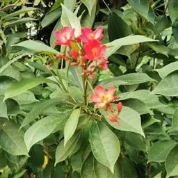 变叶珊瑚花,是大戟科麻风树属常绿灌木。变叶珊瑚花单叶互生,倒阔披针形,叶面为浓绿色,叶背为紫绿色,…