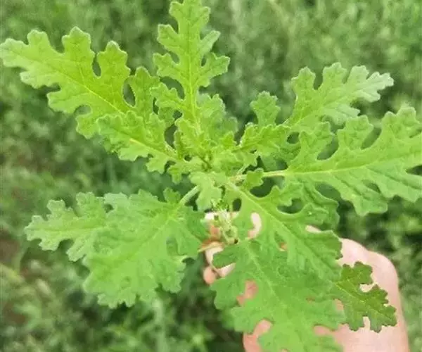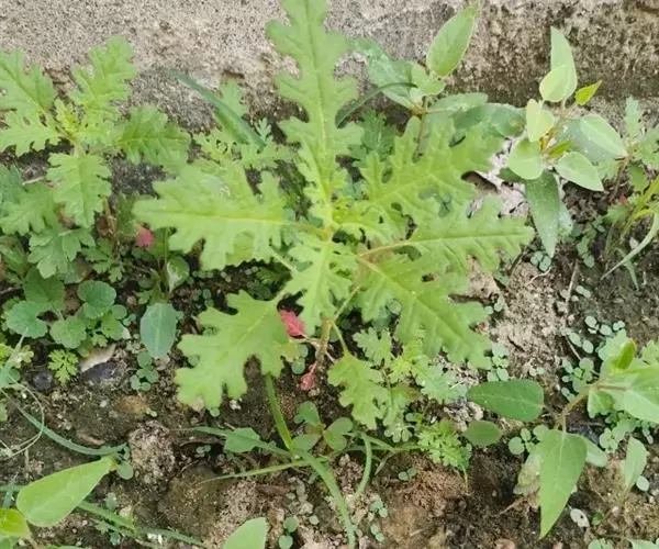 一年生草本,高20-60厘米,有强烈气味,全体有具节的疏生短柔毛。茎直立,具绿色色条,通常有分枝。叶片矩圆形,长2-6厘米,宽1.5-3.5厘米,边缘羽状浅裂至羽状深裂,先端钝或渐尖,有时具短尖头,基部渐狭,上面无毛或幼嫩时稍有毛,下面有具节的短柔毛并兼有黄色无柄的颗粒状腺体,很少近于无毛;叶柄长2-10毫米。