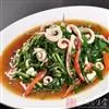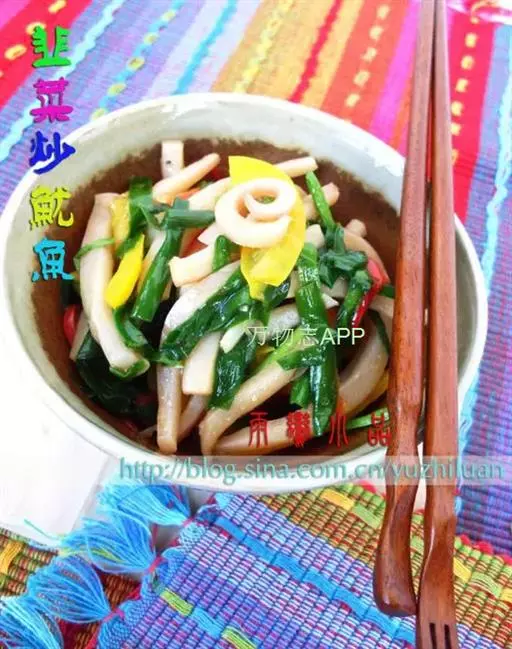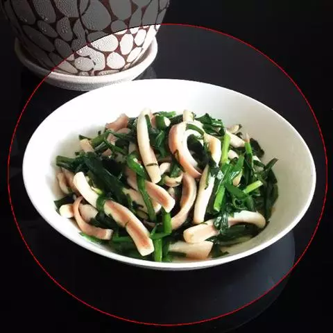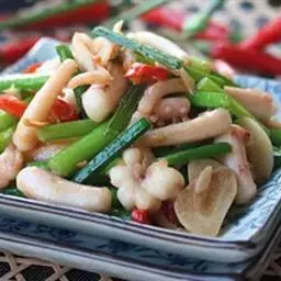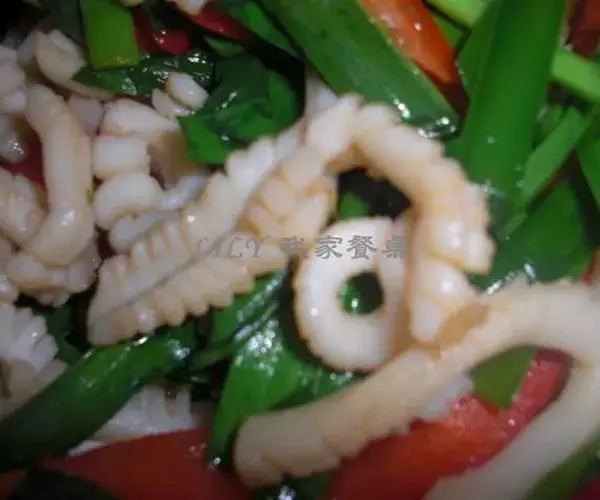 11. 放入韭菜翻炒1分钟后,将鱿鱼倒入再炒30秒;