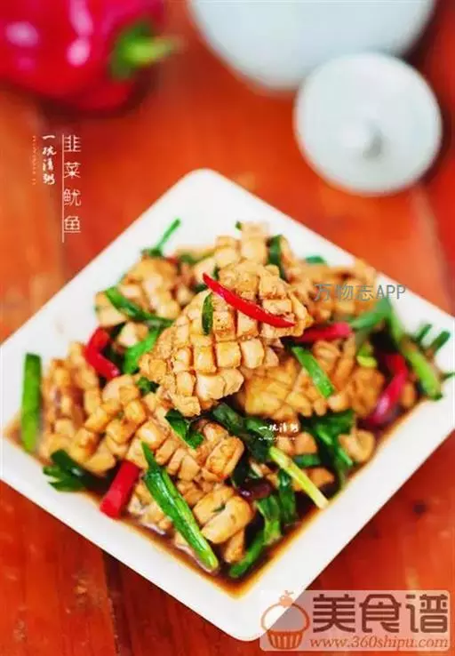 鱿鱼的切法:先从左角开始切,刀和鱿鱼呈45度的角,切那种连皮不要断刀的斜线就可以了;然后换反方向再从右角切交叉的斜线,最后再切成长方型的小块。
