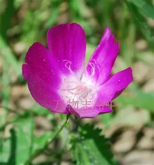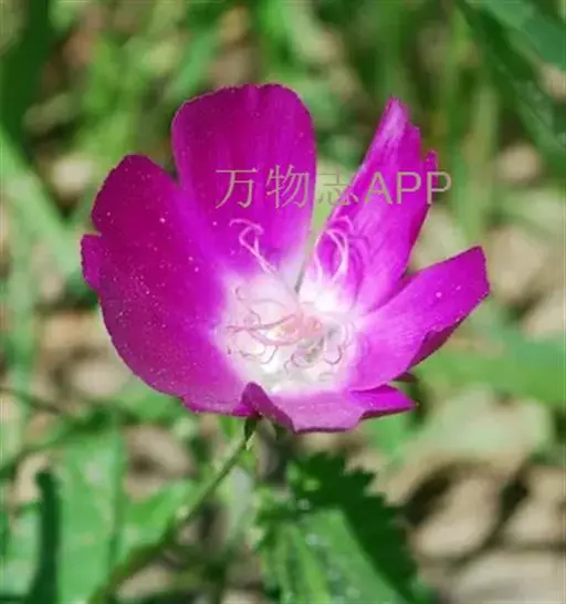 多年生草本,具白色粗壮主根。匍匐茎长达60~90cm,株高15至20厘米,匍匐茎长达50至90厘米。有毛。单叶互生,5~7深裂。花径6cm,紫红色,花期夏季。花瓣5枚,玫瑰红色,花心白色,花期7至8月,果期9至10月。