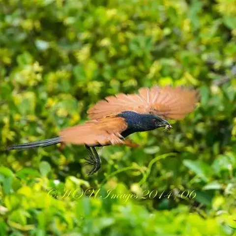 斑翅凤头鹃: 成鸟具羽冠,上体及头侧、翅、尾等黑色,具铁绿色亮辉,尾羽端部具白斑,两侧者形宽,…