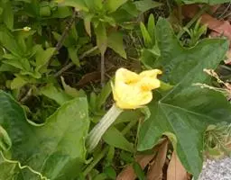 雌雄同株,雌、雄花均单生。雄花:花梗细,比叶柄稍长,花梗、花萼、花冠均被微柔毛;花萼筒漏斗状,长约2厘米,裂片披针形,长5毫米;花冠黄色,裂片皱波状,长3-4厘米,宽2-3厘米,先端微缺而顶端有小尖头,5脉;雄蕊3,花丝长3-4毫米,花药长8-10毫米,长圆形,药室折曲。雌花花梗比叶柄稍短或近等长;花萼和花冠似雄花;花萼筒长2-3毫米;子房中间缢细,密生粘质长柔毛,花柱粗短,柱头3,膨大,2裂。果实初为绿色,后变白色至带黄色。