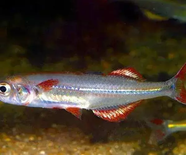 腹腔膜灰白色,带有小黑点。生活时背部灰绿色,体侧银白色,腹部白色。背鳍和尾鳍的上叶灰绿色,腹鳍、臀鳍和尾鳍的下叶鲜红色,胸鳍灰黄色。