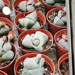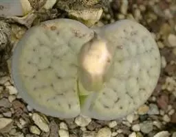 荒玉为番杏科生石花属,原产南非。株体呈白粉色,表面布满凹凸纹路,凹陷处为红褐色,每年秋季开黄花。