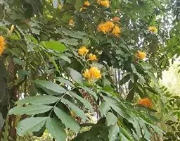 1、香槐又名:黄槐。落叶乔木,高4-10m。树皮灰褐色;散布圆形皮孔。叶互生,奇数羽状复叶;小叶7-11片,小叶柄5-8mm;叶片卵状椭圆形、卵状长椭圆形或长椭圆形,长5-11cm,宽2.5-4cm,先端短渐尖或骤尖,基部宽楔形至近圆形,上面深绿色,无毛,下面苍绿色,沿主脉上被浅棕褐色柔毛。圆锥花序疏松,顶生及腋生,长12-18cm;花长1.5-2cm;花萼钟状,先端具5齿裂,裂齿三角形,密生黄棕色短柔毛;蝶形花冠,白色;雄蕊10,长短不等,近分离;子房线形,具短柄,表面密被浅棕褐色绢状柔毛,花柱向上弯,柱头狭尖。荚果条形,扁平,长3.5-8cm,宽约8mm,密生毛。种子2-4颗,肾状椭圆形,长约4mm,光滑。花期6-7月,果期9-10月。