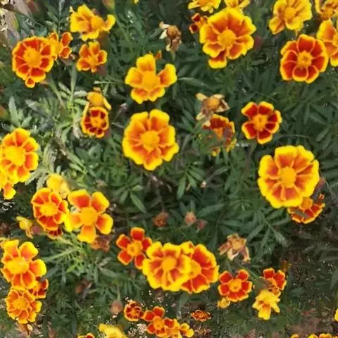 万寿菊是菊科万寿菊属一年生草本植物,别名孔雀菊、缎子花、臭菊花、西番菊、红黄草、小万寿菊、臭芙蓉、孔雀草。万寿菊茎近基部分枝。叶羽状分裂,长5-10厘米,宽4-8厘米,裂片长椭圆形或披针形,具锐齿,上部叶裂片齿端有长细芒,叶缘有少数腺体。头状花序单生,径5-8厘米,花序梗顶端棍棒状。总苞长1.8-2厘米,径1-1.5厘米,杯状,顶端具尖齿。舌状花黄或暗橙黄色,长2.9厘米,舌片倒卵形,长1.4厘米,基部成长爪,先端微弯缺。管状花花冠黄色,长约9毫米,冠檐5齿裂。瘦果线形,被微毛;冠毛有1-2长芒和2-3短而钝鳞片。花期7-9月。万寿菊中国各地均有栽培,在广东和云南南部、东南部已归化,国外原产墨西哥。万寿菊对土壤要求不严,但以肥沃疏松排水良好的土壤为好。耐移栽,种子发芽适温21-24℃,植株生长适合温度为20-29℃。喜温暖和阳光充足的环境,不