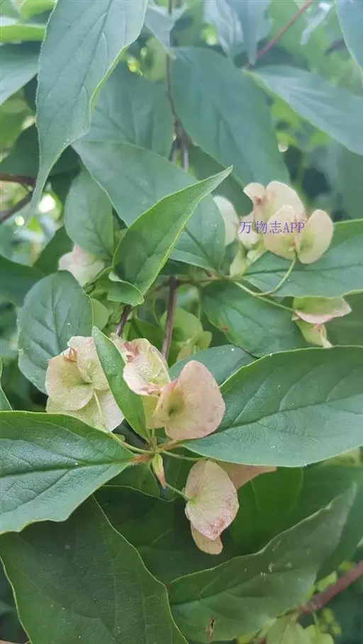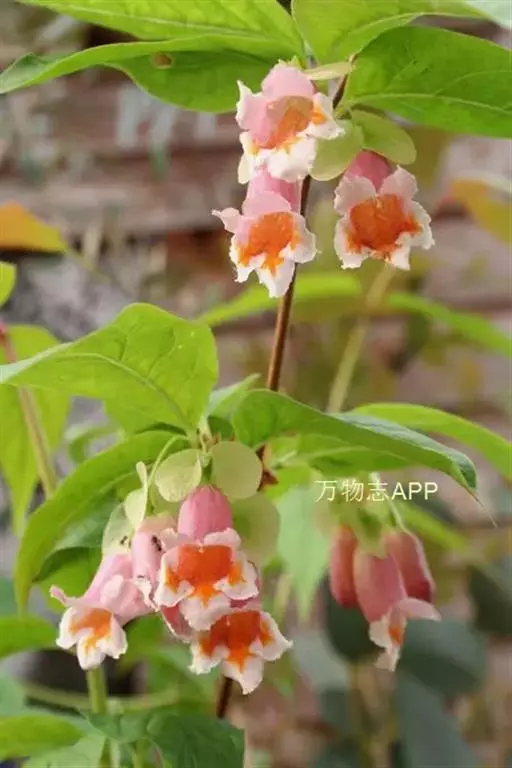 落叶灌木,高达4m;幼枝被柔毛。冬芽具3-4对鳞片。叶椭圆形至宽披针形,长5-10cm,宽2-4cm,顶端渐尖至长渐尖,基部钝圆至近圆形,全缘或稀具疏浅齿,上面疏生微柔毛,主脉下陷,下面沿脉被白色长柔毛,边缘具睫毛;叶柄长约5mm。伞房状聚伞花序生于短枝顶部叶腋;小苞片2对,一对较小,卵形,不等形,另一对较大,肾形;萼檐膜质,被柔毛,裂至2/3处,萼齿钻状条形,不等长,长约4-5mm;花冠白色至粉红色,钟形,长2-4cm,基部一侧有浅囊,二唇形,喉部具柔毛及黄色块状斑纹;花丝无毛;花柱较雄蕊长,不伸出。果实圆卵形,被柔毛,顶端狭长,2对宿存的小苞片明显地增大,其中一对网脉明显,肾形,以其弯曲部分贴生于果实,长2.5-3cm,宽1.5-2cm;种子扁,内面平,外面延生成脊。花期5-6月,果熟期5-11月。