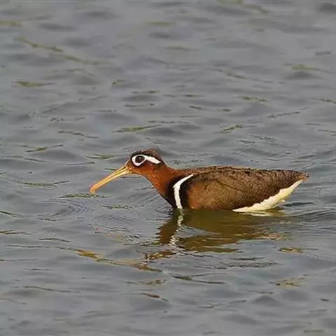 彩鹬(学名:Rostratula benghalensis)是彩鹬科、彩鹬属下的一种小型涉禽,体长25cm左右。嘴细长,尖端向下弯曲,雄鸟头具淡黄色中央纹。眼周黄色,并向后延伸成一柄状带。背具白色横斑,两侧具黄色纵带。胸侧至背有一白色宽带。雌鸟喉和前颈粟色。眼周和向后延伸的柄白色。幼鸟与雄鸟相似。 虹膜暗褐色嘴黄褐色。脚灰绿色。