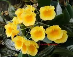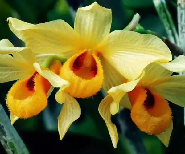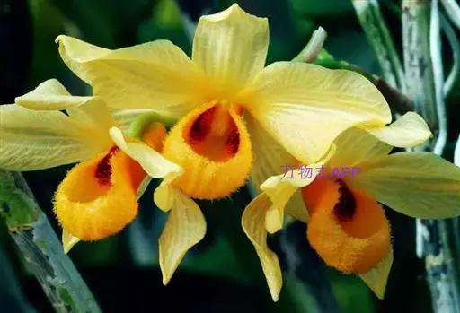 杓唇石斛(学名:Dendrobium moschatum (Buch.-Ham.) Sw.):茎粗状,质地较硬,直立,圆柱形,不分枝,具多节。叶革质,二列;互生于茎的上部,长圆形至卵状披针形。总状花序出自去年生具叶或落了叶的茎近端,下垂,长约20厘米,疏生数至10余朵花;花深黄色,白天开放,晚间闭合,质地薄;花瓣斜宽卵形,长2.6-3.5厘米,宽1.7-2.3厘米,先端钝,具7条脉;唇瓣圆形,边缘内卷而形成杓状。花期4-6月。