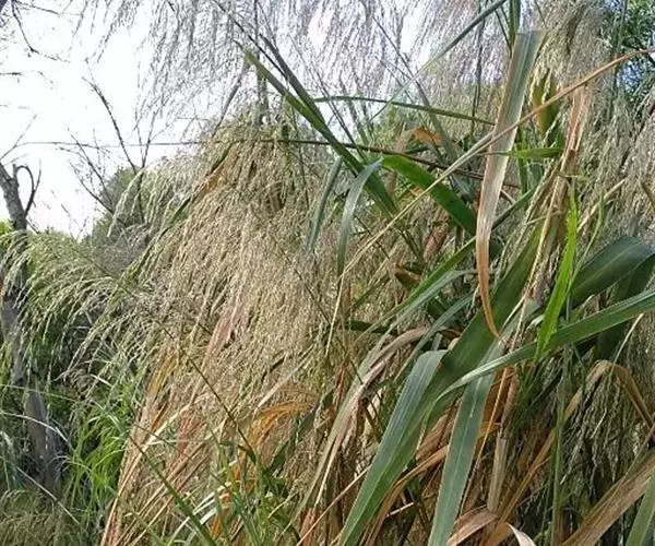 多年生,具木质根状茎,须根粗而坚硬。秆直立,高2-3米,径5-10毫米,通常节具分枝,节间被白粉;叶鞘无毛,仅沿颈部具柔毛;叶舌密生柔毛;叶片长30-60厘米,宽5-10毫米,扁平或卷折,顶端长渐尖,无毛或上面生柔毛。圆锥花序长30-60厘米,分枝细长,开展或下垂;小穗长6-8毫米,含5-8小花,第一外稃不孕,无毛;颖片短小;长2-3毫米;外稃长约4毫米,边脉生有长约2毫米的柔毛,顶端具长1-2毫米向外反曲的短芒;内稃短于外稃。花果期8-12月。染色体2n=20(Kalia1978)。