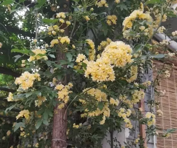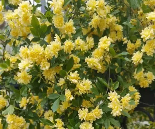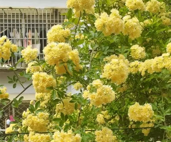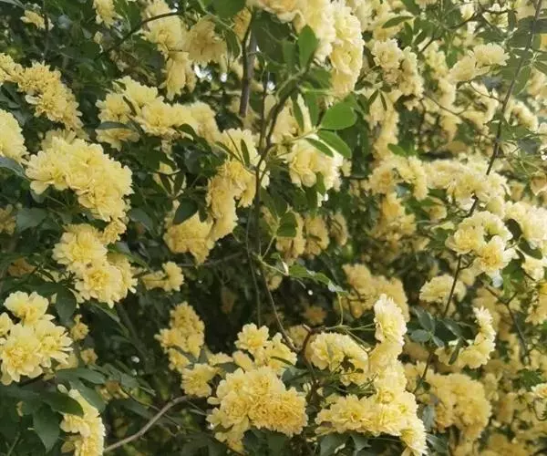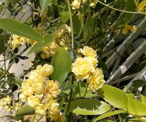 黄木香花(学名:Rosa banksiae Ait. form. lutea (Lindl.) Rehd.)是攀援小灌木,高可达6米;小枝圆柱形,无毛,有短小皮刺;叶3-5,叶片椭圆状卵形或长圆披针形,花小形,多朵成伞形花序,萼片卵形,花黄色重瓣,无香味,倒卵形,花期4-5月。花朵较多,花期较长。产自中国江苏。