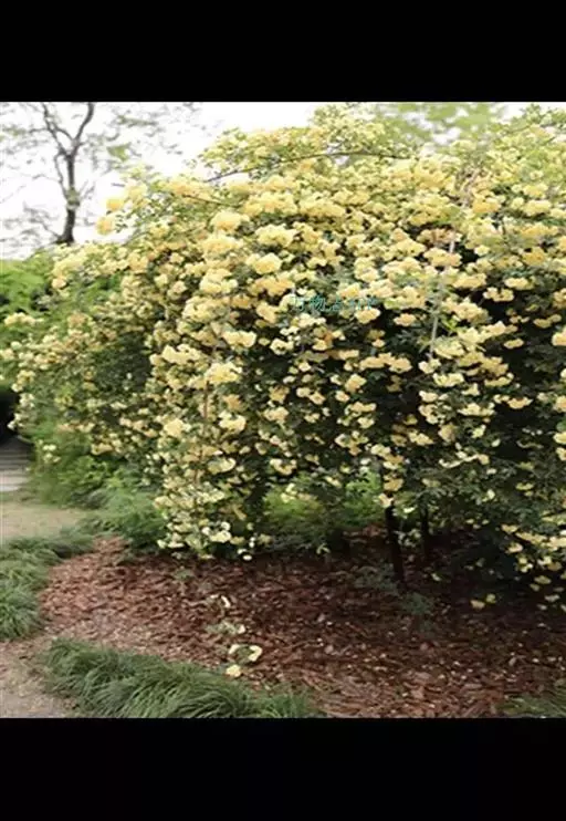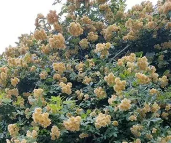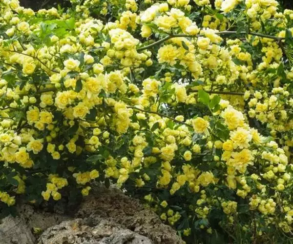 黄木香花 攀援小灌木,高可达6米;小枝圆柱形,无毛,有短小皮刺;老枝上的皮刺较大,坚硬,经栽培后有时枝条无刺。小叶3-5,稀7,连叶柄长4-6厘米;小叶片椭圆状卵形或长圆披针形,长2-5厘米,宽8-18毫米,先端急尖或稍钝,基部近圆形或宽楔形,边缘有紧贴细锯齿,上面无毛,深绿色,下面淡绿色,中脉突起,沿脉有柔毛;小叶柄和叶轴有稀疏柔毛和散生小皮刺;托叶线状披针形,膜质,离生,早落。花小形,多朵成伞形花序,花直径1.5-2.5厘米;花梗长2-3厘米,无毛;萼片卵形,先端长渐尖,全缘,萼筒和萼片外面均无毛,内面被白色柔毛;花黄色重瓣,倒卵形,先端圆,基部楔形;心皮多数,花柱离生,密被柔毛,比雄蕊短很多。花期4-5月。