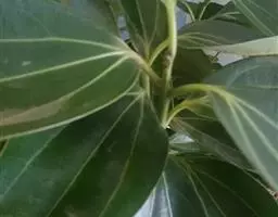 常绿乔木,高约15米,叶、枝及树皮干时几不具芳香气。枝条及小枝褐色,圆柱形,无毛。叶对生或近对生,卵圆形至长圆状卵圆形,长8-11(14)厘米,宽4-5.5(9)厘米,先端锐尖,基部圆形,革质,上面鲜时绿色,干时灰绿色,光亮,下面近同色,晦暗,两面无毛,具离基三出脉,侧脉自叶基约1厘米处生出,近叶片3/4处渐消失或不明显网结,有时近叶缘一侧各有一条附加的侧脉,细脉两面明显,呈浅蜂巢状网结;叶柄长约1.5厘米,腹凹背凸,红褐色或褐色。