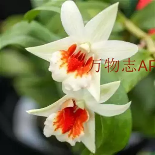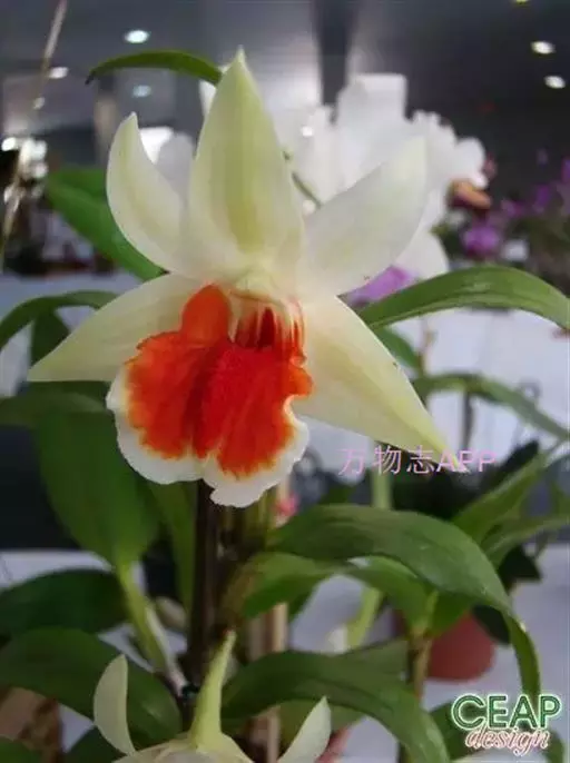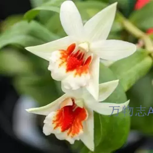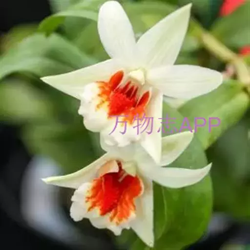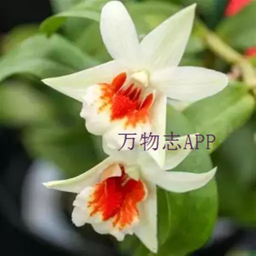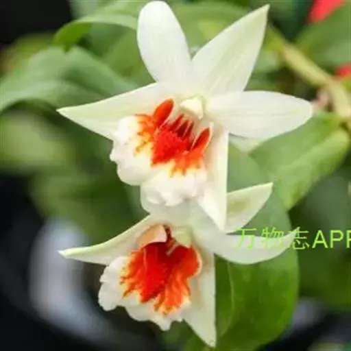 唇瓣淡黄色或白色,带橘红色的唇盘,长约2.5厘米,3裂;侧裂片围抱蕊柱,近倒卵形,前端边缘稍波状;中裂片近圆形或宽椭圆形,先端锐尖,边缘波状;唇盘沿脉纹疏生粗短的流苏;蕊柱长约6毫米;药帽短圆锥形,前端边缘密生短髯毛。花期4-5月。