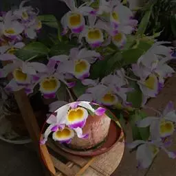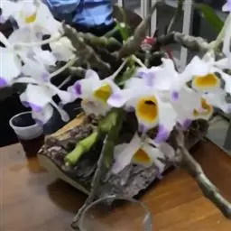 通常选用四壁多孔的塑料或陶瓷花盆,用碳根、泥炭藓、树皮块、木炭块等作盆栽材料。根据兰苗的大小,选择不同规格的花盆,但不宜用大盆栽小苗口上述栽好材料在使用前必需在清水中浸泡1天以上备用。盆底要多垫大瓦片或碎砖块,深度至盆底约1/3处,然后将兰苗放于盆中央,并在一旁插一细竹竿以固定兰苗,再填入其他栽培材料,注意根与根之间用材料隔开。