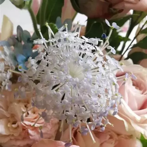 花为繖形花序,分散生于走茎的叶腋处,花序梗长于叶柄,长 5~15 公分,被有柔毛;繖形花序有花 18~26 朵,密生成球形的头状花序;花柄极短,长 0.1~0.15 公分,花柄基部有膜质、卵形或倒卵形的小总苞片;无萼齿;花瓣 5 枚,渐尖形,白色或乳白色;花柱幼时内卷,花后向外反曲,基部隆起。花果期 4~11 月。