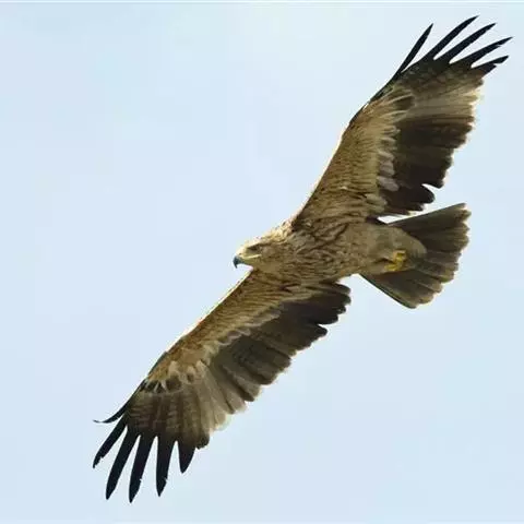 白肩雕:又名御雕,是大型猛禽。体长73-84厘米。体羽黑褐色,头和颈较淡,肩部有明显的白斑,在黑褐…