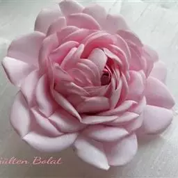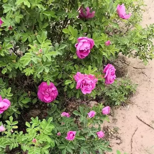 直立灌木,高可达2米;茎粗壮,丛生;小枝密被绒毛,并有针刺和腺毛,有直立或弯曲、淡黄色的皮刺,皮刺外被绒毛。小叶5-9,连叶柄长5-13厘米;小叶片椭圆形或椭圆状倒卵形,长1.5-4.5厘米,宽1-2.5厘米,先端急尖或圆钝,基部圆形或宽楔形,边缘有尖锐锯齿,上面深绿色,无毛,叶脉下陷,有褶皱,下面灰绿色,中脉突起,网脉明显,密被绒毛和腺毛,有时腺毛不明显;叶柄和叶轴密被绒毛和腺毛;托叶大部贴生于叶柄,离生部分卵形,边缘有带腺锯齿,下面被绒毛。花单生于叶腋,或数朵簇生,苞片卵形,边缘有腺毛,外被绒毛;花梗长5 -22.5毫米,密被绒毛和腺毛;花直径4-5.5厘米;萼片卵状披针形,先端尾状渐尖,常有羽状裂片而扩展成叶状,上面有稀疏柔毛,下面密被柔毛和腺毛;花瓣倒卵形,重瓣至半重瓣,芳香,紫红色至白色;花柱离生,被毛,稍伸出萼筒口外,比雄蕊短很多。果扁球形,直径2-2.5厘米,砖红色,肉质,平滑,萼片宿存。花期5-6月,果期8-9月。 粉玫瑰