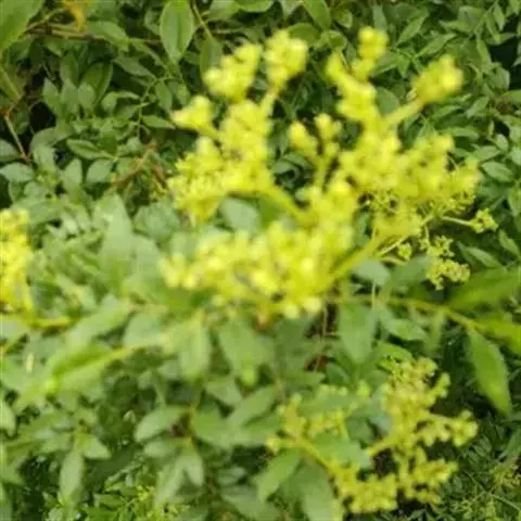 伞房状圆锥花序,顶生,长3-8厘米;花小而多,青色,单性,萼片及花瓣均5片;花瓣淡黄白色,长约2毫米。雌花有心皮3-5个。