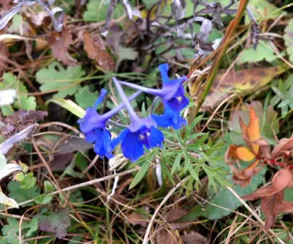 裂瓣翠雀(变种):与翠雀的区别:退化雄蕊的瓣片二裂近中部。产云南洱源。