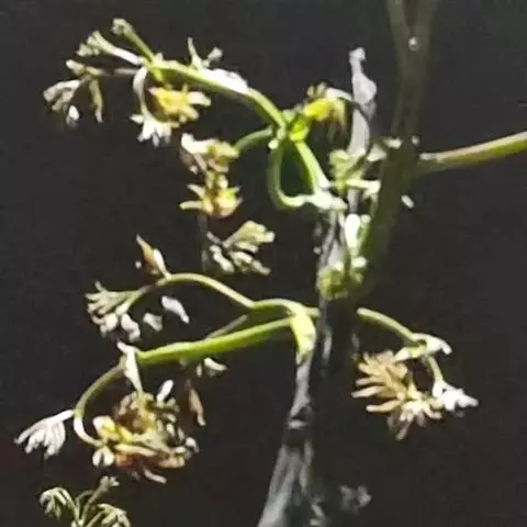 顶生疏松的圆锥花序,长5-8厘米,直径2-3厘米;花梗长3-6毫米,总花梗和花梗均无毛;苞片小,披针形至线状披针形;萼筒杯状,无毛;萼片三角卵形,长约2毫米,先端钝,有短尖,全缘;花瓣倒卵形,稀长圆形,长约2毫米,先端钝,白色;雄蕊10,着生在萼筒边缘,较花瓣短约一半;心皮1,子房外被柔毛,花柱顶生,直立。蓇葖果近球形,直径约2毫米,被稀疏柔毛,具宿存直立的萼片;种子1,卵球形。花期5月,果期7-8月。