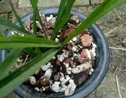 准备好兰盆及植料后,将兰株倒拿(根在上,叶在下)放于水龙头下以慢水冲洗,但水压切忌过强,以免伤兰根及叶子。用拇指和食指抓住兰头,小指抵住盆缘,用竹筷将根固定,当放入盆内时,尽量不要让根接触到盆壁。将豆粒大的混合石砾倒入盆底至三分之一处。然后倒入中粒植料至五分之四处,填实和尽量不要留下空间。将竹筷拔出,并摇实盆中植料。填实植料后,再用大粒植料埴入至距盆缘1.5厘米处。最后再倒入豆粒大植料,以将假鳞茎全部埋入土中为度,然后充分摇实。用压土工具轻压植料,并将表面弄平。种植完毕后,植料在盆中以中央稍高为好。